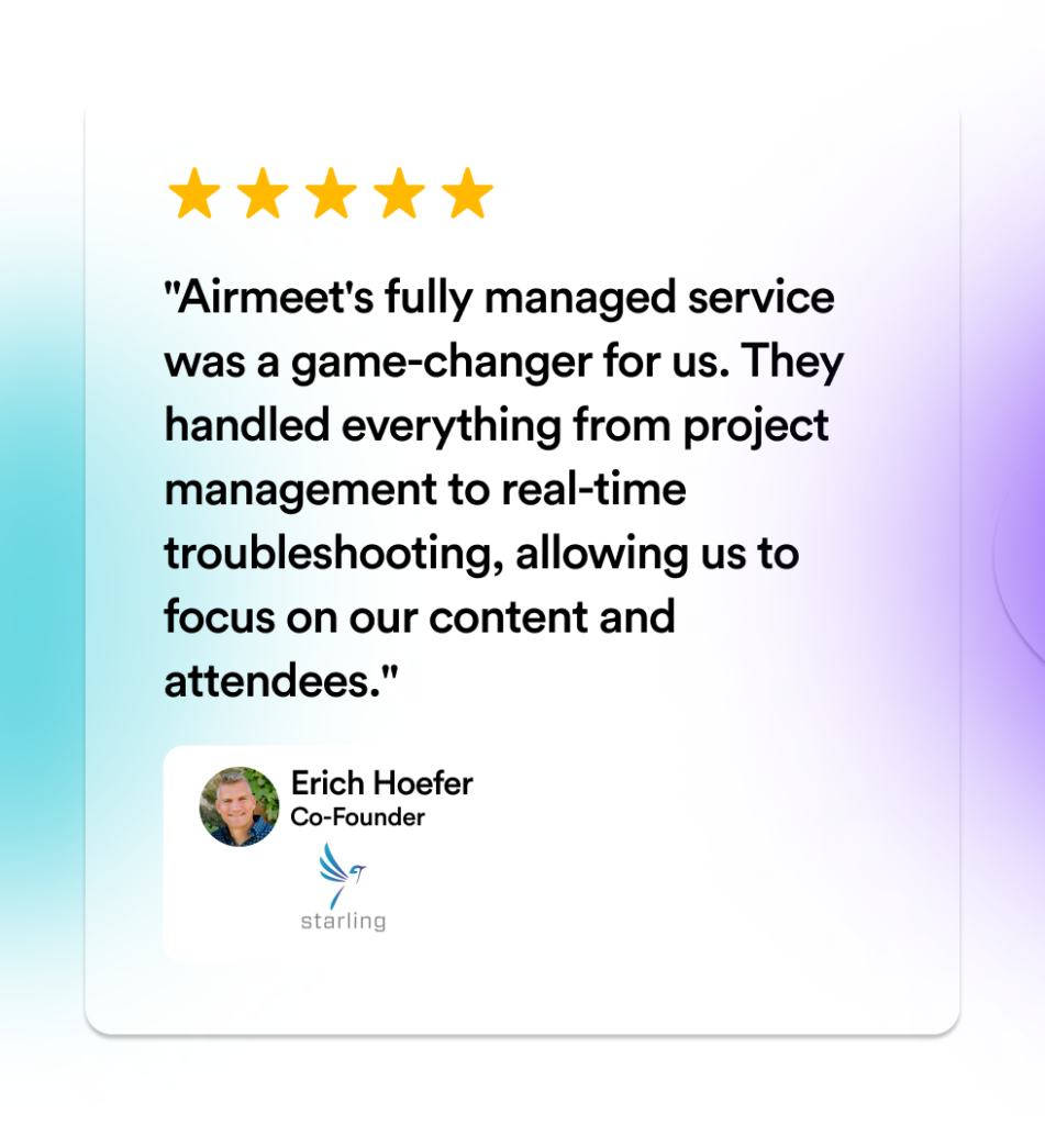 Airmeet’s Fully Managed Event Service provided Starling Trust Sciences with a flexible, scalable solution that met their high standards for professionalism and attendee engagement. The dedicated support and robust platform features allowed Starling to focus on delivering high-quality content while Airmeet handled the technical aspects of the event.