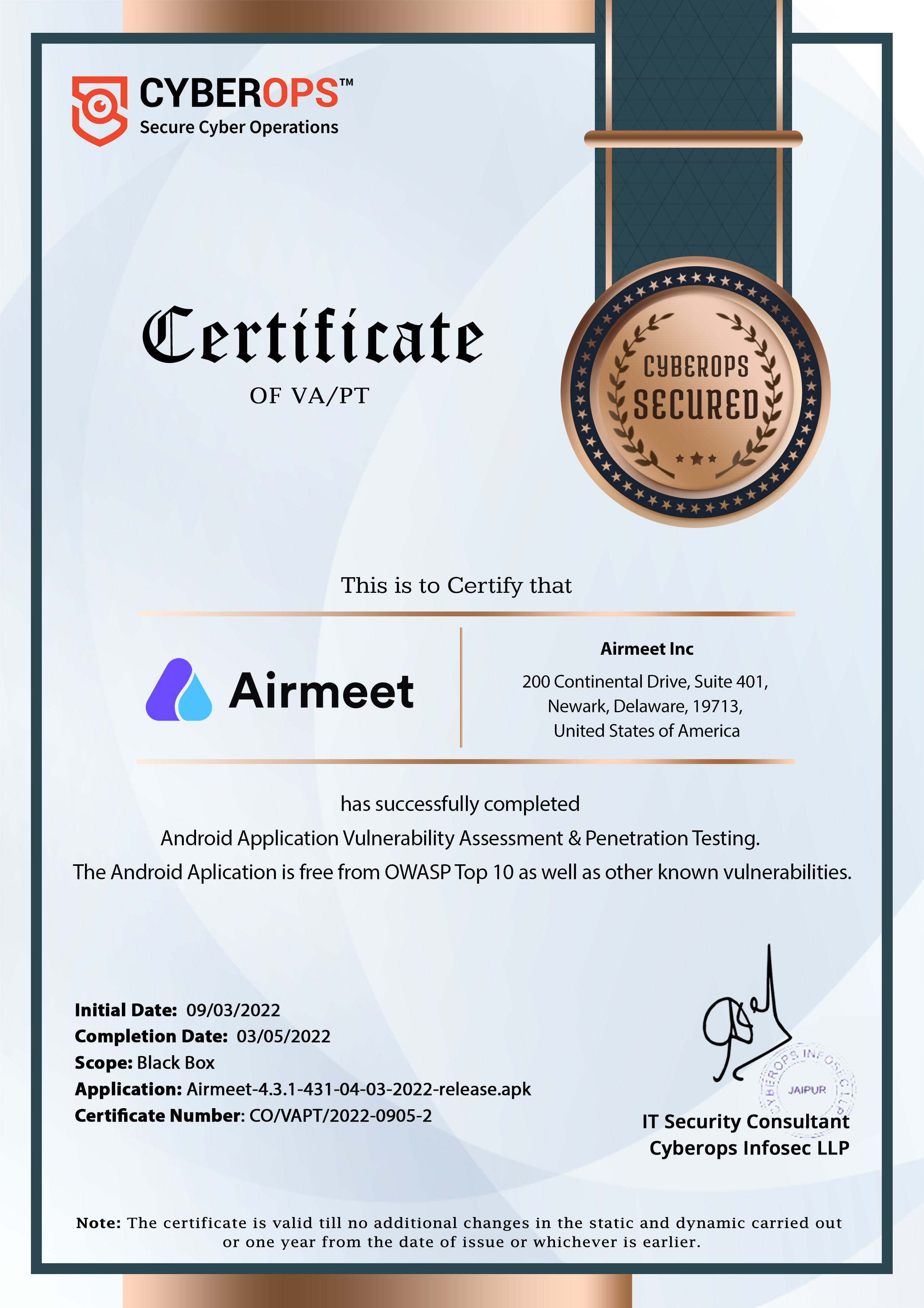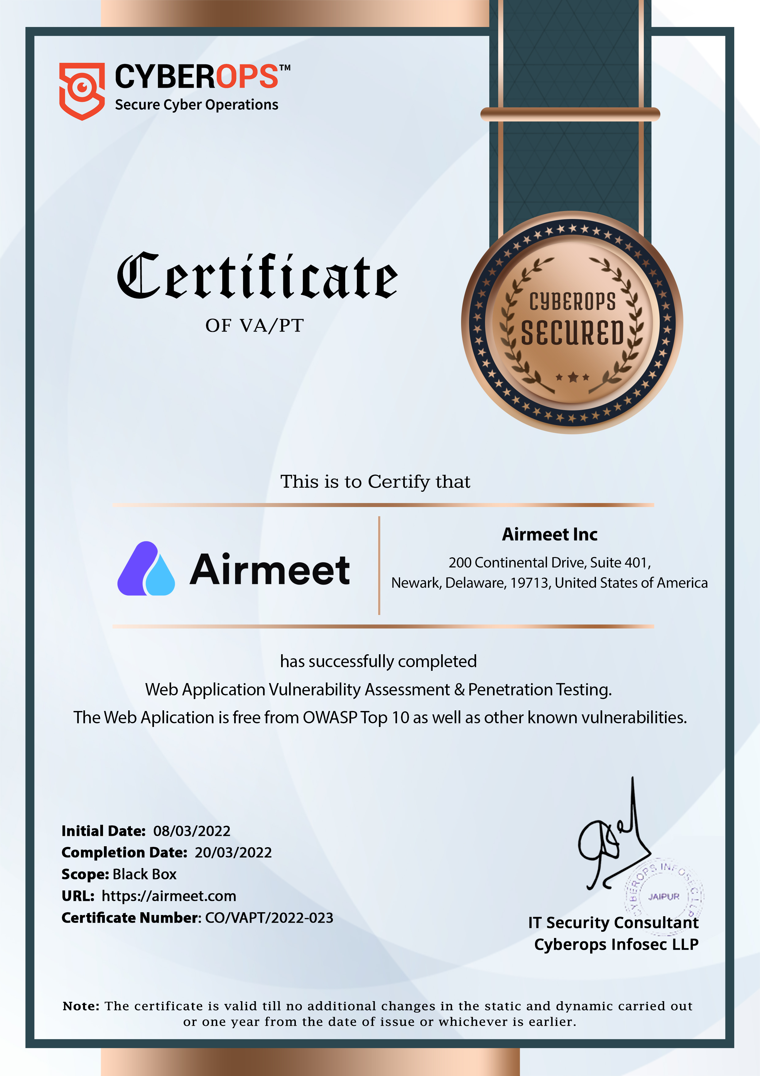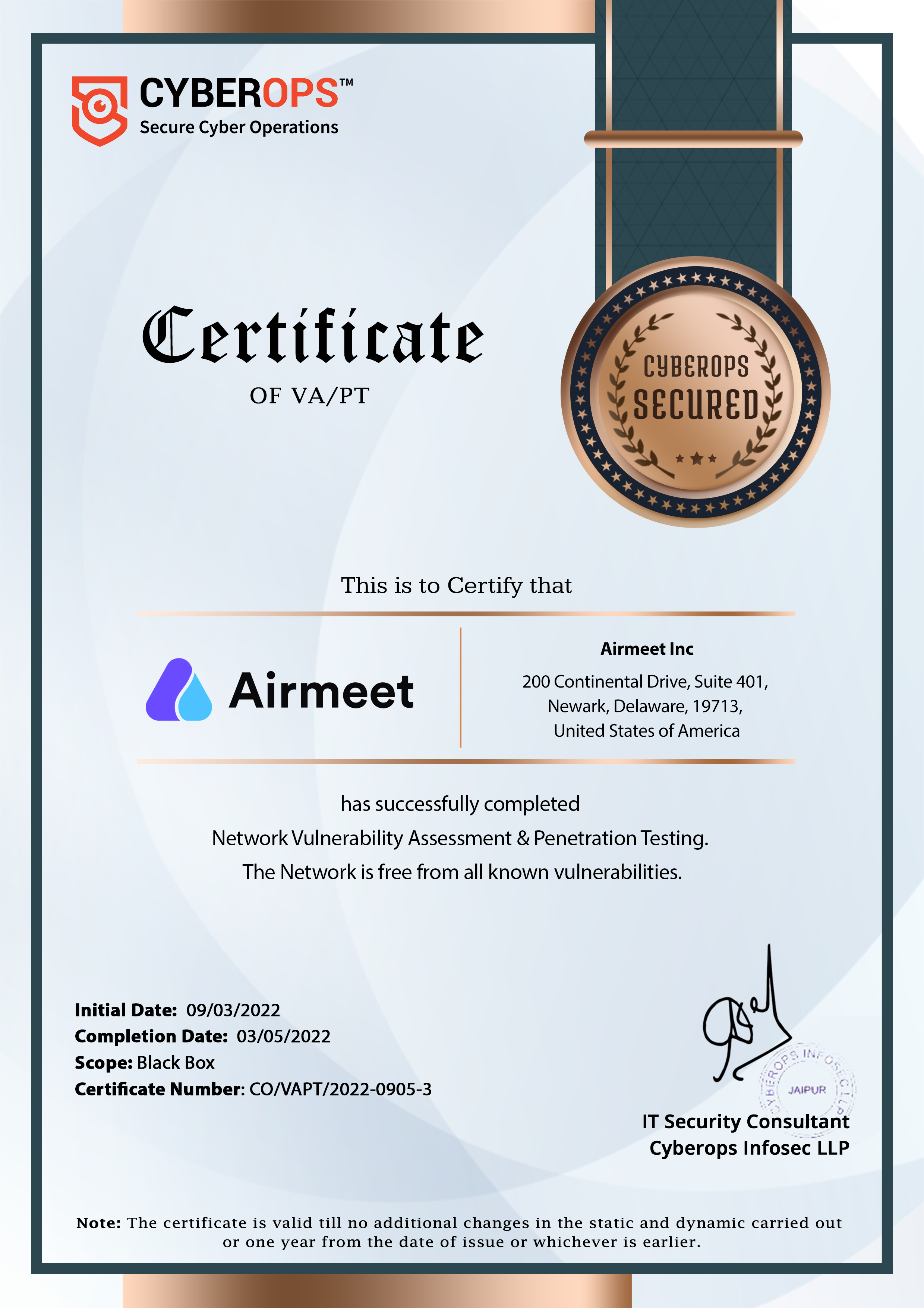 Airmeet conducts Vulnerability Assessment and Penetration testing on its Application and Network from a third party. Reports are available based on request. We conduct VAPT on our infrastructure network and applications through a third party. Please find the recent VAPT certificates.