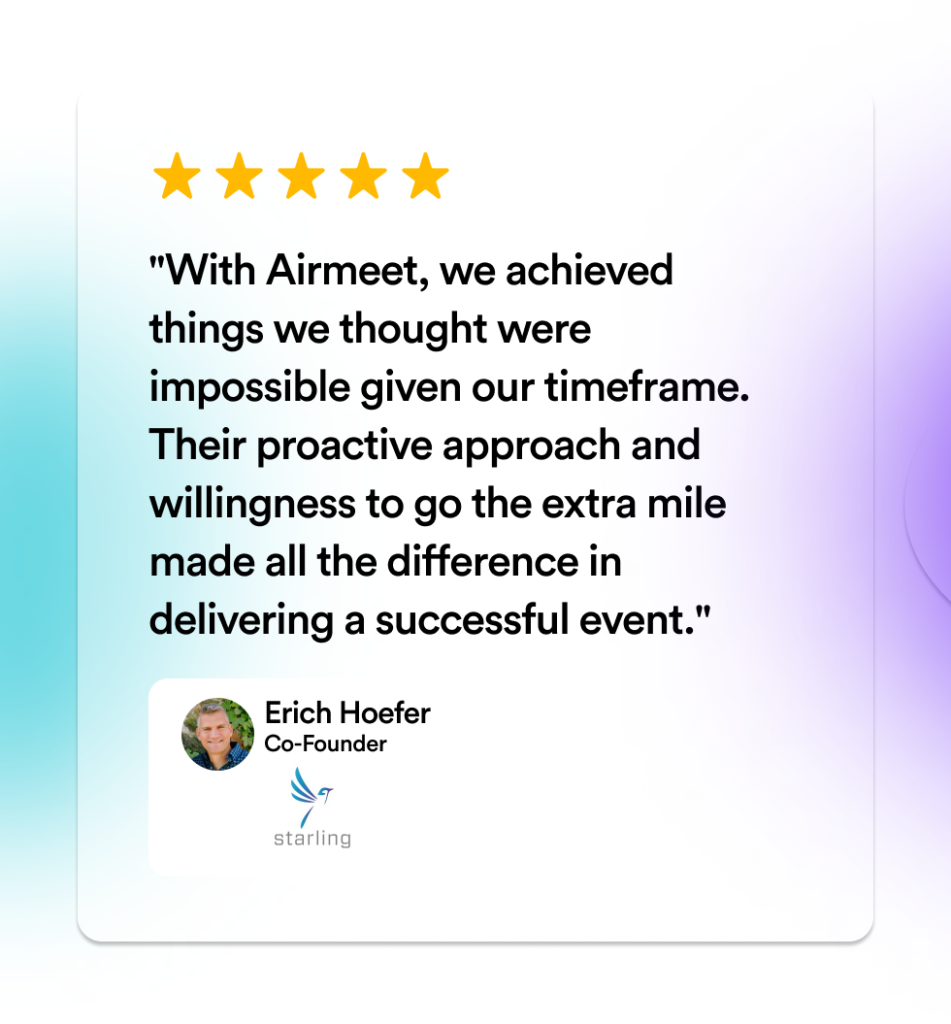 Erich Hoefer, Co-Founder at Starling Trust Sciences, recognized the need for a robust virtual event platform that could handle their complex requirements and tight timeline. That’s when they discovered Airmeet’s Fully Managed Event Service.